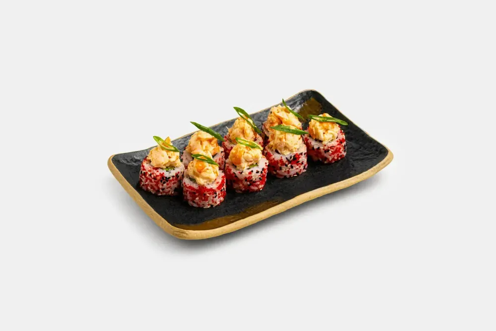 Взрывной вкус для тех, кто любит погорячее! Сочная креветка и нежный творожный сыр встречаются с пикантностью соусов Спайси и Шрирача. Битые огурцы и спелый авокадо добавляют освежающий хруст, а икра масаго и кунжут завершают эту дерзкую композицию