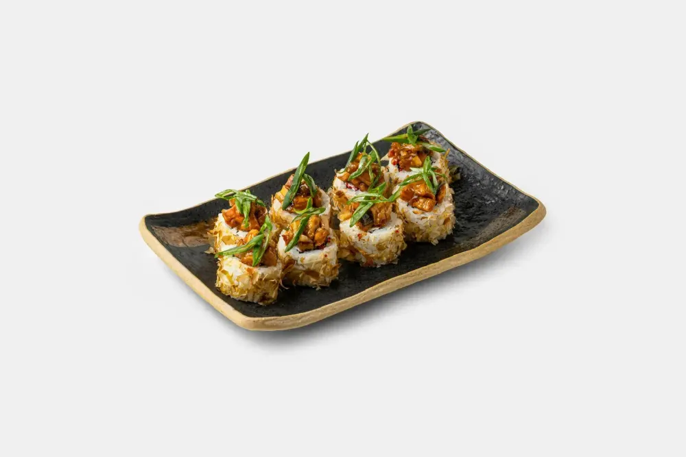 Насыщенный ролл с нежным рисом, ароматным угрём и мягким творожным сыром. Спелый авокадо добавляет кремовую текстуру, а икра масаго — яркий солоноватый акцент. Стружка тунца придаёт лёгкий дымный вкус и глубину, а кунжут завершает ролл тонкой ореховой ноткой.