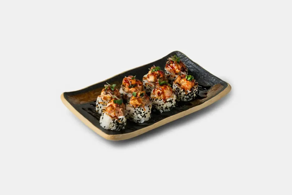 Яркий ролл с выразительным вкусом тунца и сливочным сыром. Освежающий огурец, хрустящая икра масаго и густой соус терияки с кунжутом делают это блюдо идеальным выбором для ценителей насыщенной азиатской кухни. Ролл запекается сверху, при подаче в заведении будет теплым, в доставке будет холодным.
