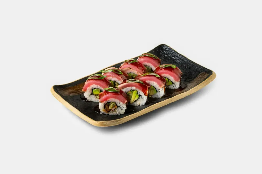 Многогранное сочетание текстур: бархатистый тунец, хрустящий огурец и кремовый авокадо. Яркая икра масаго эффектно дополняет вкус, а классический дуэт соуса терияки и обжаренного кунжута придает блюду завершенный азиатский колорит